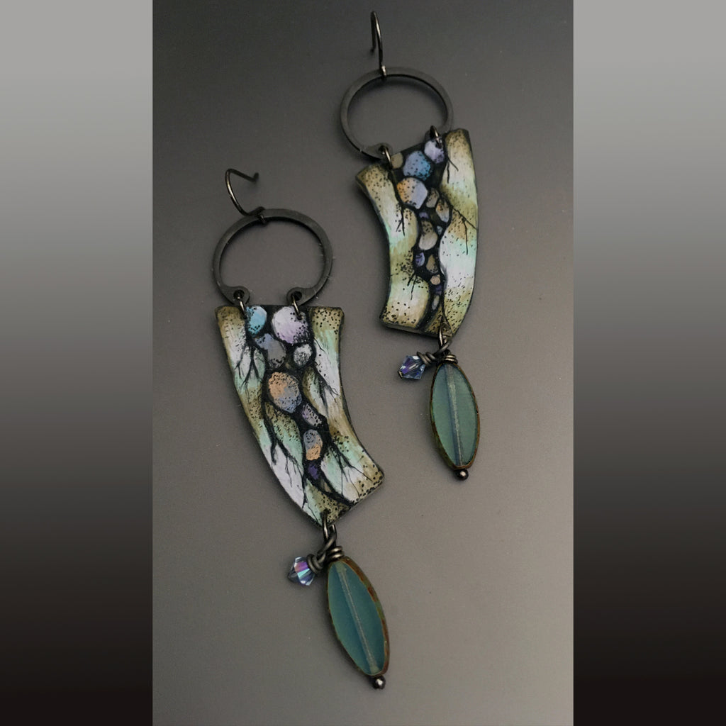 Sealed Hand Colored Shrink Art material with Czech Glass, Swarovski Crystal and metal c-clip component with Gunmetal tone Lead Free ear wires. 3" inches long. Fun, Bold & Light Weight!