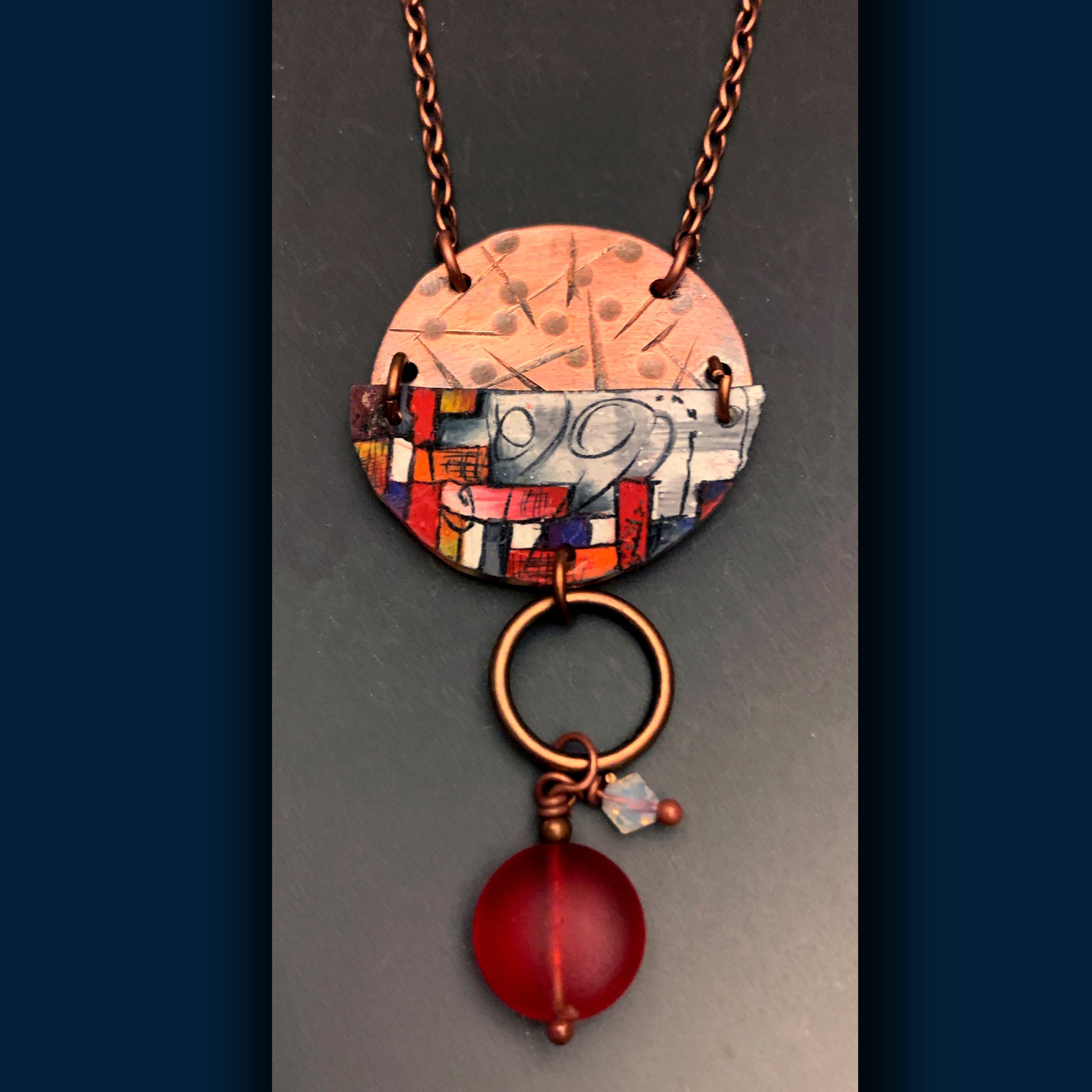 Hand forged copper shapes textured, patina & attached to sealed hand drawn "Shrink art" material. All pendants have an with Recycled Glass puff bead and Swarovski crystal which are suspended on 18 inch copper chain with lobster clasp.