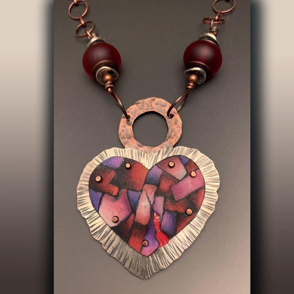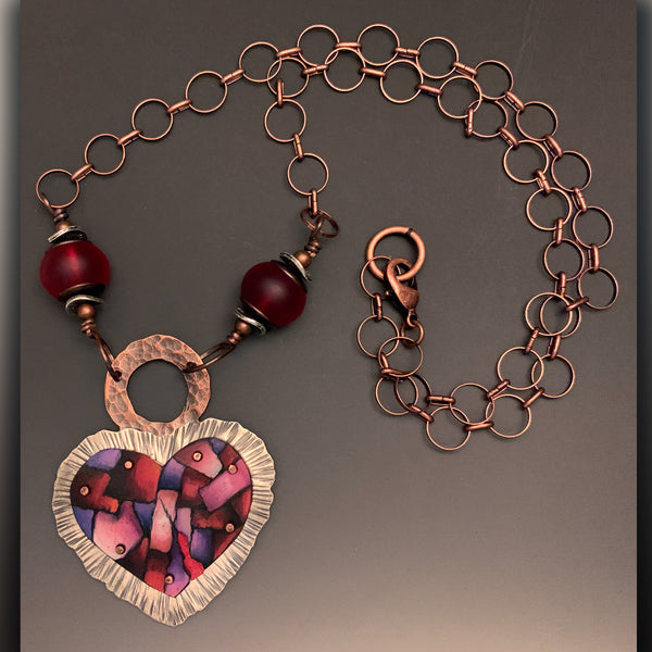 Fretwork in Copper and Sterling Silver, hand forged, textured, patina & riveted to sealed hand drawn "Shrink art" material , Vintaj Patina, Sea Glass, 18" Copper Tone Chain with lobster clasp